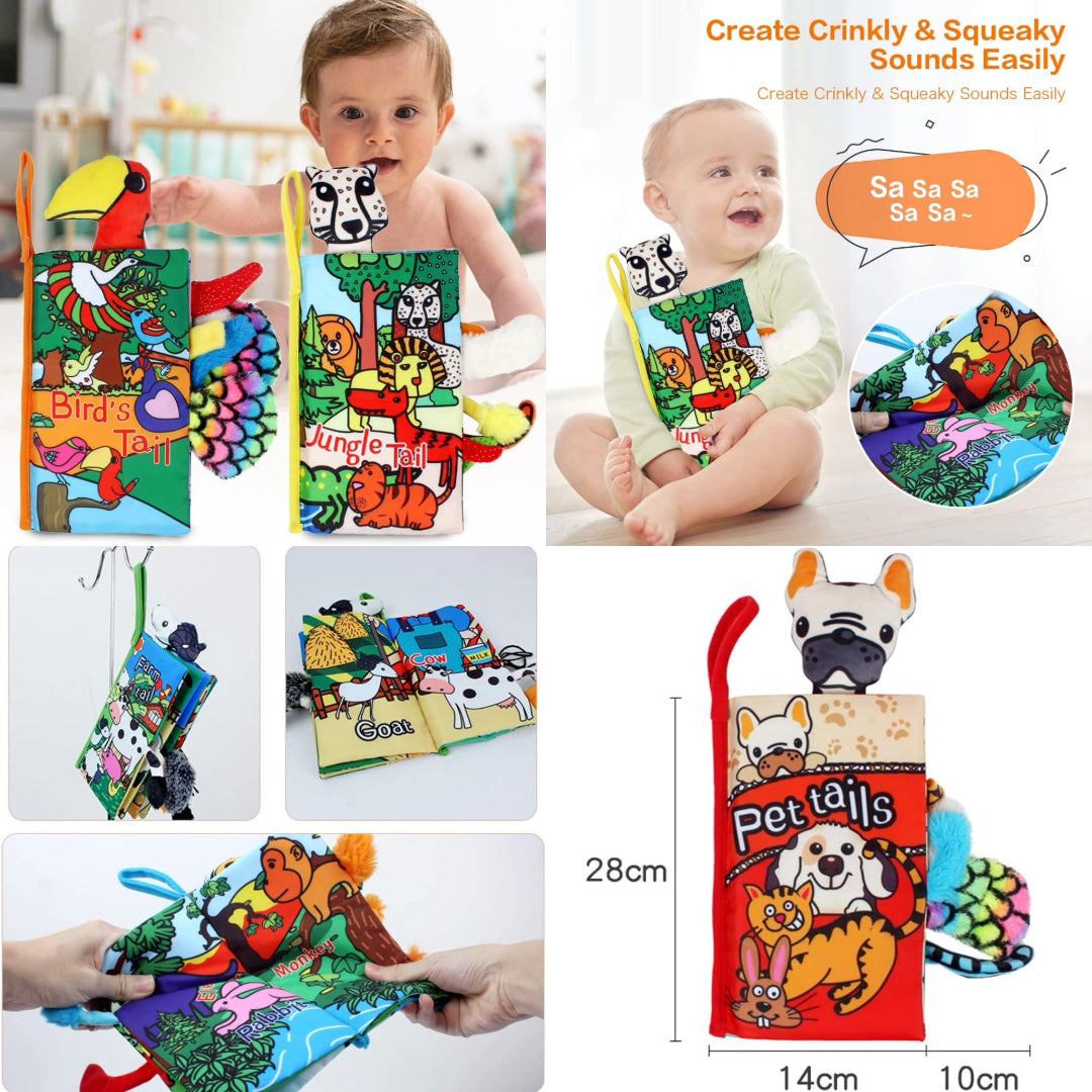 These baby sensory crinkle books are designed to engage little ones through touch and sight, making early learning both fun and interactive. Each soft book features colorful animal characters with textured tails that encourage tactile exploration.