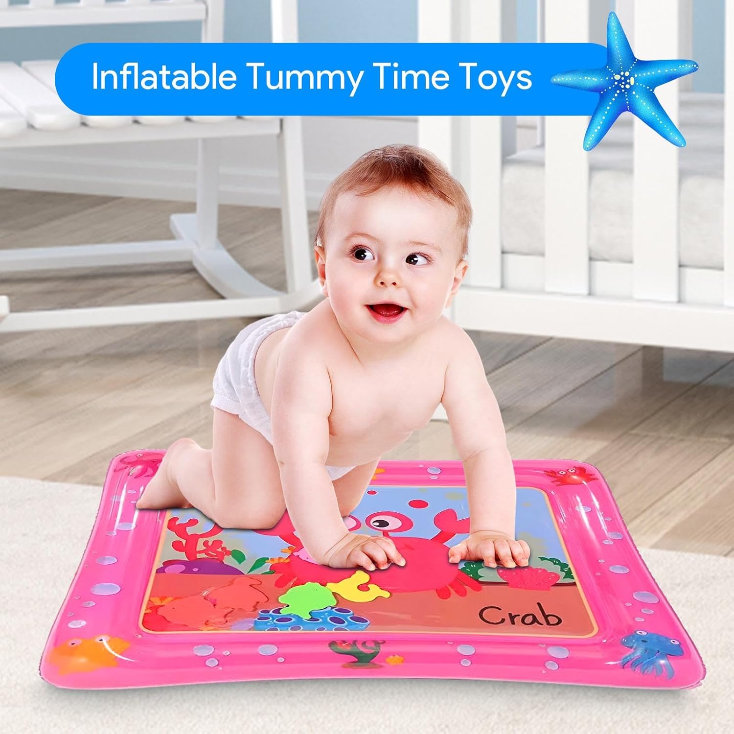 This inflatable water baby tummy time mat is designed to support your little one's sensory development during crucial early months. Combining soft, durable materials with engaging, colorful sea animal illustrations, this tummy time mat encourages babies to develop strength and coordination in a fun, interactive way.